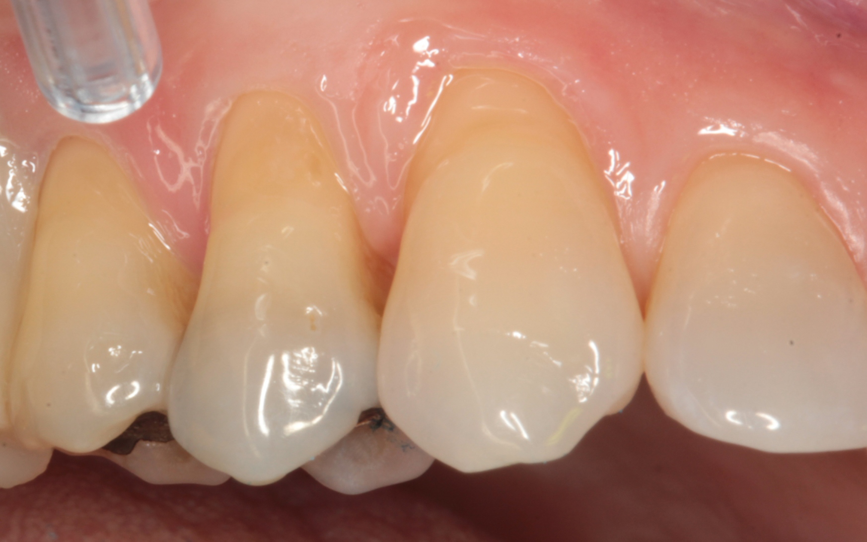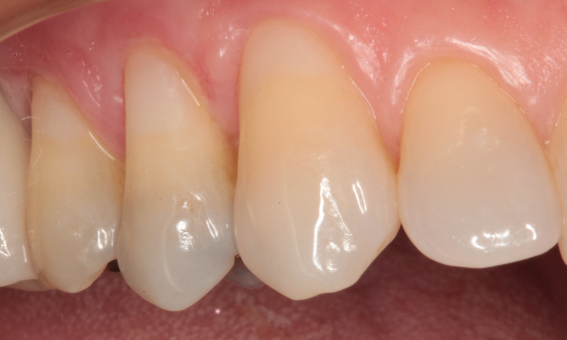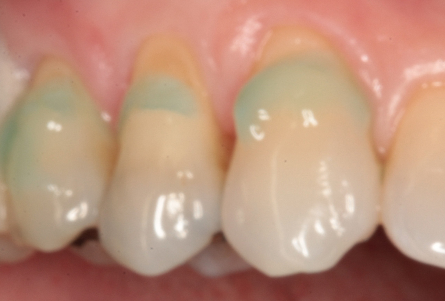 Figure 1 shows a patient with non-carious Class V grooving in the canine, first premolar and second premolar teeth. The molar has already been restored with a full crown. Restoration was desired by the patient for esthetic reasons.