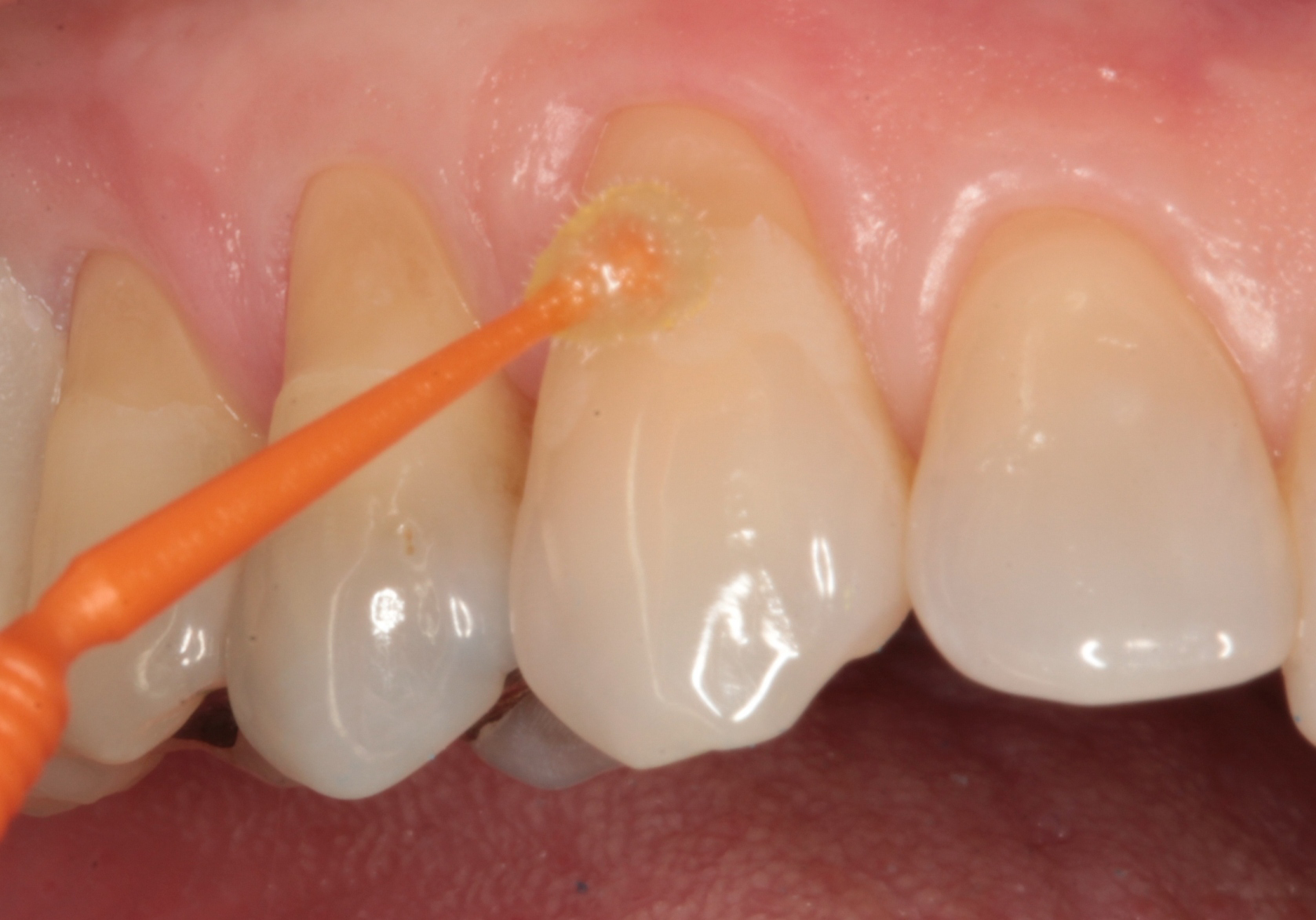 The etching gel was thoroughly rinsed with water from an air/water syringe (Fig. 4) and lightly air dried. I then applied a universal bonding agent (Brush and Bond, Parkell). The bonding agent was messaged in for ten seconds using an applicator tip (Fig. 5).