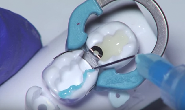 For selective etching at the enamel-dentin junction, avoiding the risk of sensitivity on dentin is a top priority. Using Prime&Bond elect® with Caulk® 34% Tooth Conditioner Gel in a selective-etch application gives you excellent application control. The etchant gel viscosity allows you to trace the enamel margins, while minimizing the chance of it dripping or slumping onto the dentin.
