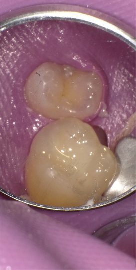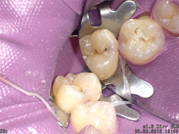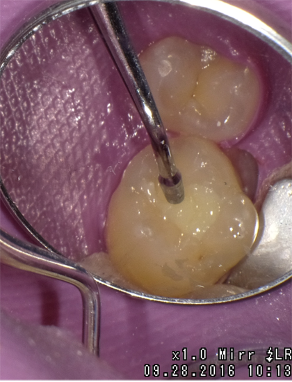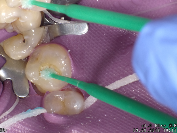 The next clinical sequence features Admira Fusion clinical steps restoring occlusal tooth #14 (Fig. 8). Tooth restoration was completed with a calcium hydroxide liner placed where remaining dentin thickness appeared to be 2 mm or less. Figure 9 illustrates completed cavity preparation, followed by placement of Admira Bond after 15 second phosphoric acid etching (Fig. 10).