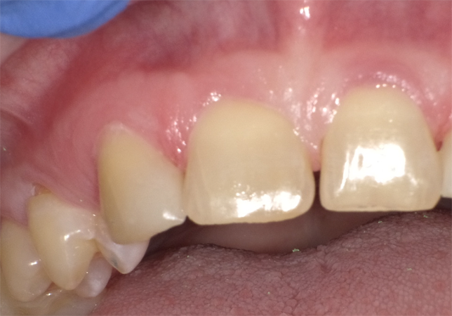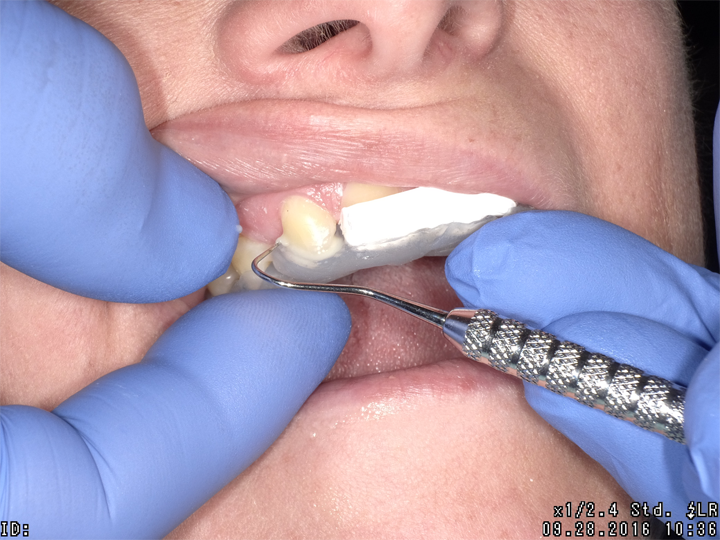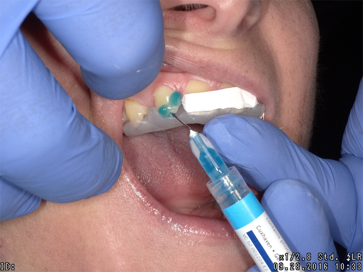 Using the silicone stent with Teflon tape, acid etching was completed with no rotary instrumentation of enamel (Fig. 3). Admira Fusion Flow incisal shade was placed (Fig. 4) and cured (Fig. 5), developing an outline form to resemble a lateral incisor.