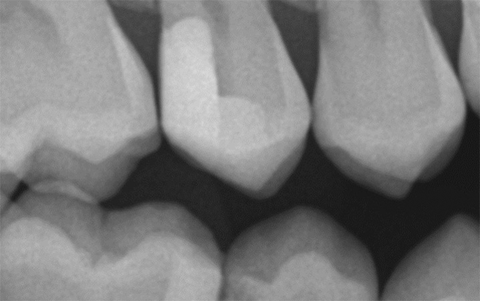 The all ceramic-based chemistry and high filler loading of Admira Fusion products combine to create a very radiopaque restorative material. Premarket evaluation comments specifically addressed Admira Fusion's remarkable radiodensity and superb esthetics, an uncommon combination.14Figure 15 illustrates a two surface Admira Fusion x-tra restoration at recall. The bitewing radiograph taken several months after restoration placement confirms radiopacity slightly exceeding that of enamel, a nice feature for esthetic restorative materials. It was known at the time of placement that advanced caries encroached on the dental pulp hence a thin calcium hydroxide liner was placed to protect the pulp and a dentin bridge is now evident. The patient reported 'no post-operative sensitivity' and no pulp problems have been identified.