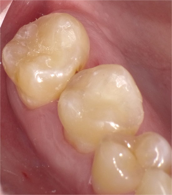 Occlusal restoration of the centralateral molar, tooth #3, is shown immediately after placement and curing (Fig.13). While tooth #14 was restored incrementally using a layer of Admira Fusion A2 veneered with Admira Fusion Incisal, tooth #3 was restored with Universal shade Admira Fusion x-tra, bulk-fill technique (Fig. 14). Polymerization shrinkage is exceptionally low for both Admira Fusion placed incrementally and is slightly higher when Admira Fusion x-tra is placed and cured in bulk, up to 4 mm thickness. Because of the esthetic limitations associated with a single shade, Admira Fusion x-tra is not indicated for Class III and Class IV (anterior) restorations, however the chameleon shading effects of a single shade material rivaled the esthetics of the incrementally placed, dual shaded restoration.