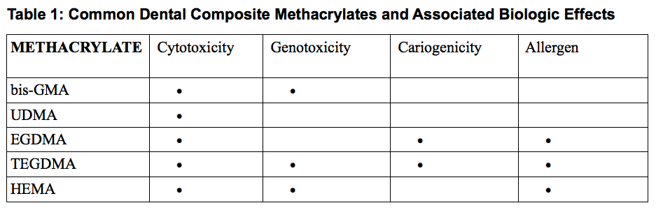 From bis-glycidyl dimethacrylate (bis-GMA), to urethane dimethacrylates (UDMA) to ethylene glycol dimethacrylates (EGDMA and TEGDMA) and hydroxyethylmethacrylate (HEMA), new “acrylics”, were added to dental composite formulations based primarily on carefully worded manufacturer claims of substantial equivalency with limited cell and animal testing. A quarter century after many substantially equivalent methacrylates entered the market; research began to suggest problems associated with cytotoxicity, genotoxicity including DNA disruption, allergy, endocrine disruption and stimulation of cariogenic microorganisms with reduced secondary dentin formation.5,6