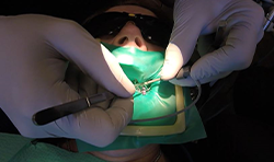 Canal measurement (m1) – The memory one mode (Fig. 6) allows for the electronic measurement of the root canal. The motor doesn’t rotate in this mode. With a lip clip applied to the corner of the mouth and file holder attached to the file in the root canal, the length can be determined (Fig. 7). As the file approaches the minor diameter or apical constriction, there’s an audible sound and the file position and overall length can be confirmed on the LCD display.