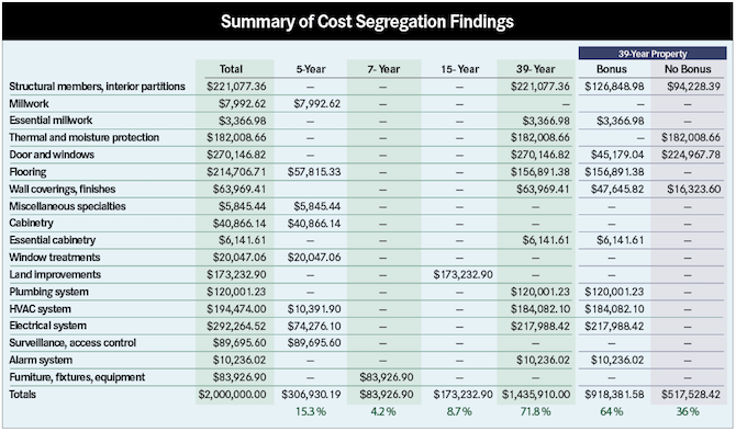 As you can see, out of the $2 million, which would have normally been depreciated over 39 years, 15.3 percent is depreciated over five years, 4.2 percent over seven years, 8.7 percent over 15 years, and the balance of 71.8 percent over 39 years. Depending on the situation, this could save tens of thousands of dollars in income tax in the first year.