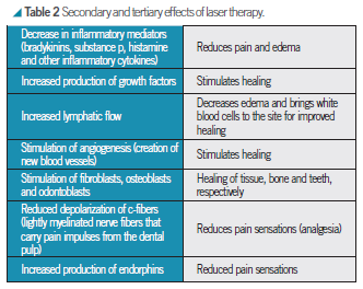 PBM works at the cellular level to stimulate the production of cellular energy in the form of adenosine triphosphate, or ATP. ATP can be thought of as the gasoline of the cell – it provides the energy needed to help a cell function and repair itself. Table 2 describes some of the secondary and tertiary effects of laser therapy.