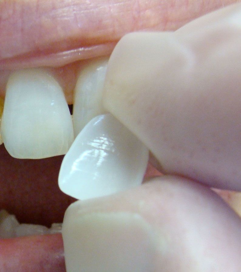 Easy placement. Done in one visit requiring only 10–15 minutes per tooth. No tooth preparation is needed and does not create undesirable bulk. It is almost effortless. Up to four veneers can be created and placed in one hour. Click here for examples.