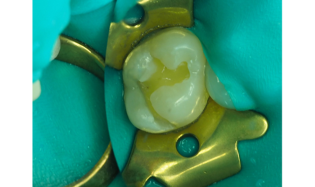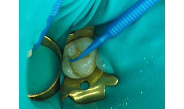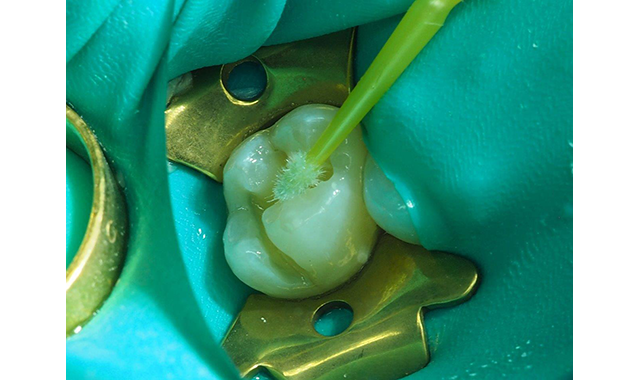 Fig. 5 The Shield Force Plus applied to the dentin for 10 seconds, slowly air-dried for 5 seconds followed by 5 seconds of strong air drying, and then light-cured for 10 seconds.