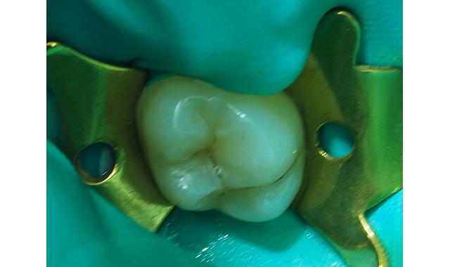 Fig. 2 Rubber dam placed post-anesthesia and the molar prepared with #330 carbide bur in high-speed handpiece with copious water spray.