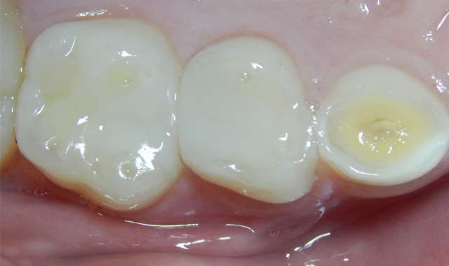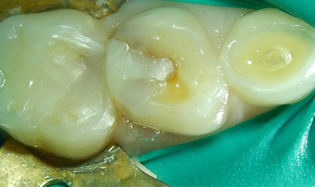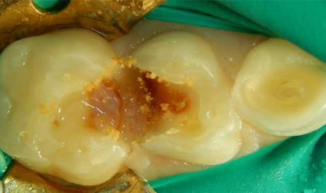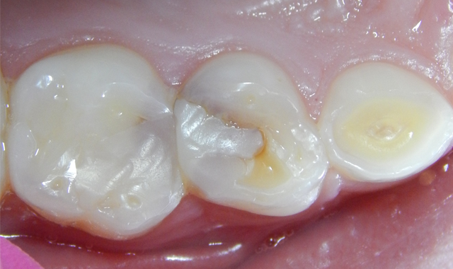 Upon the operative visit he remained very cooperative. Single Tooth Anesthesia® (Milestone Scientific) was utilized for local anesthesia and a rubber dam placed (Fig. 2). Removal of the previous restorations was quick, as they demonstrated no evidence of bond with tooth structure. Gross caries was present under the restorations along with obvious micro-leakage staining (Fig. 3).