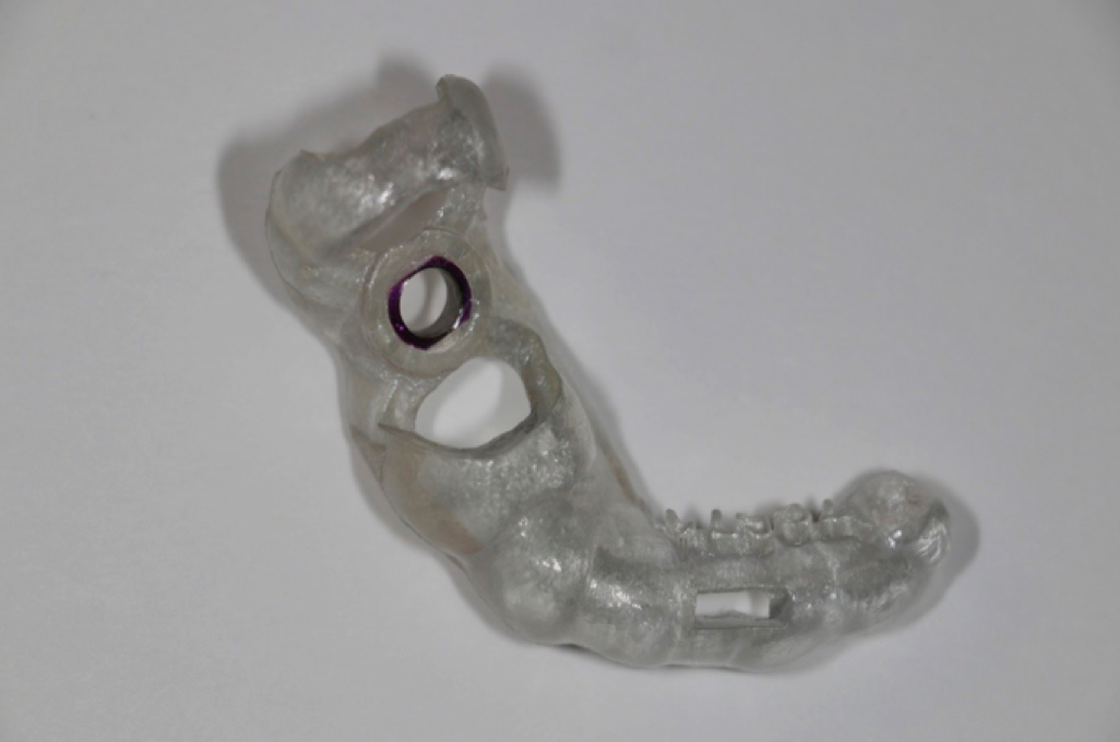 A surgical guide was printed from the implant scan. The Romexis cone beam study is transferred within Romexis to the Romexis Surgical Guide Module, where a surgical guide is designed for implant placement (Figs. 3-6). The stereolithography file (STL) for the design guide was then downloaded to 3D printer software to print the surgical guide in-house on the practice’s 3D printer.