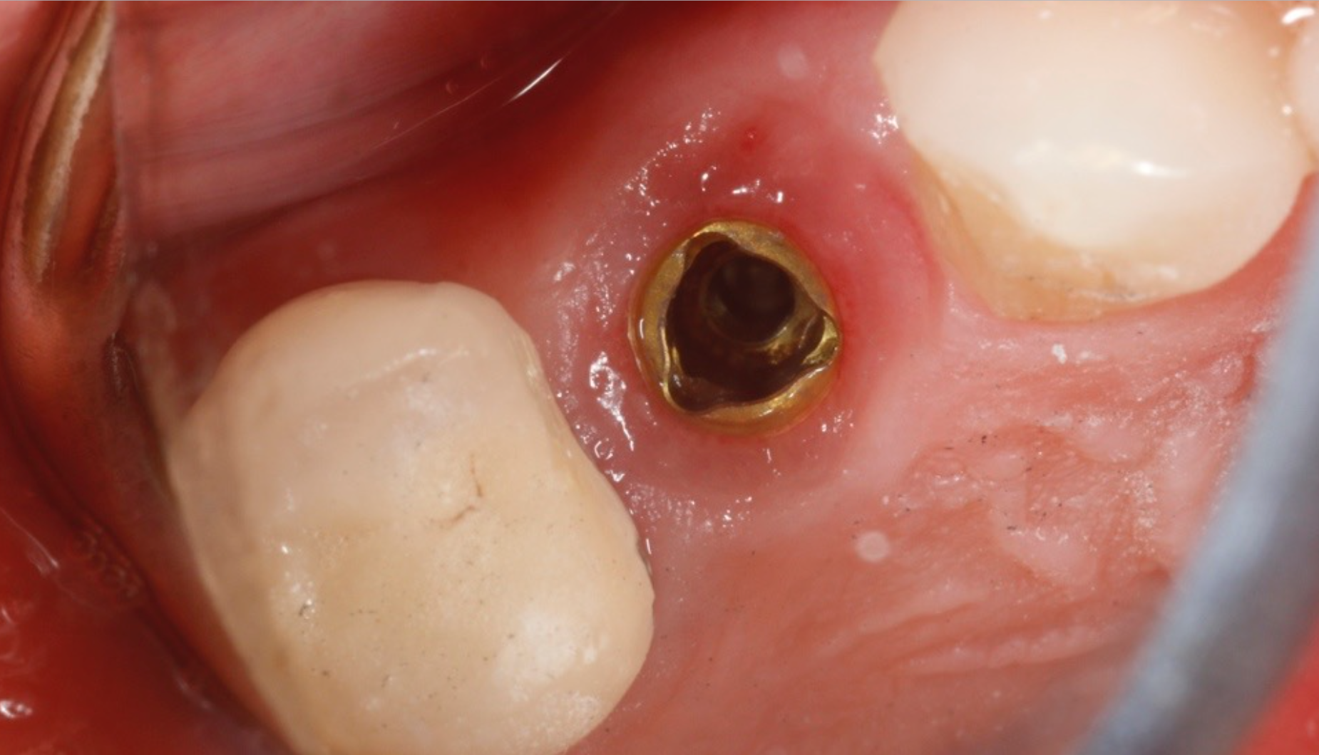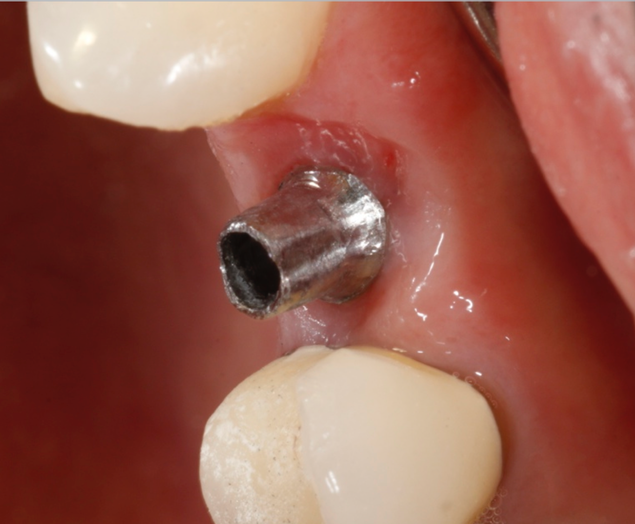 The implant in the tooth #12 area on the 50-year-old female patient is ready for restoration. In this instance, a stock abutment was selected and prepared extraorally. The abutment was placed to 25 ncm torque.