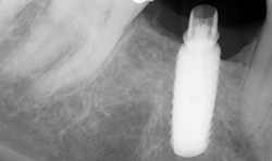 A review of the scan revealed no pathology. The bone appeared to be dense with adequate width. The mandibular nerve was drawn, showing the nerve and the foramen were safely inferior to any position the implant would be placed.