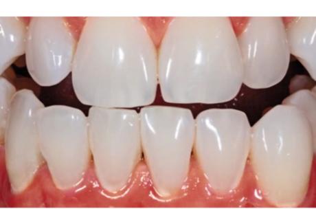Freehand direct composite veneering was performed on tooth Nos. 6, 7 and 11 using Synergy D6 composite in shades A1/B1 and WO. The tooth No. 7 restoration was designed to mirror the COMPONEER restoration on tooth No. 10. Tooth Nos. 6 and 11 required no preparation, and composite was placed to correct the acute mesial aspect canting.