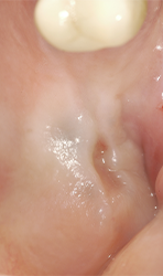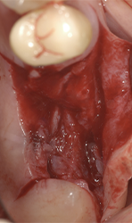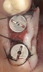 Subsequently, the soft tissues are sutured. The buccal flap is apically repositioned and stabilized with sutures tied to the margin of the palatal flap and anchored buccally with a loose loop to the periosteum at the level of the alveolar mucosa. This suture design avoids tissue traction in the repositioned buccal flap. The gap between the superficial margin of the buccally repositioned tissue and lower part of the palatal tissue, healed by secondary intention in order to increase the size of keratinized mucosa.