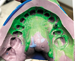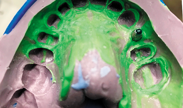 Impressions were taken using 3M™ Impregum™ Super Quick Polyether due to the patient’s severe gag response. This material has a two-minute setting time and was tolerated well by the patient. Due to the number of units being impressed, it was essential that my assistant and I be well coordinated during this procedure. Its inherent hydrophilicity resulted in an accurate impression, and contrasting colors offer good readability.
