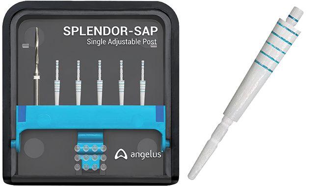 Designed to be adaptable to the canal flare, Splendor SAP posts feature a vertically sliding conical sleeve that can be positioned to fit the canal being treated. The sleeve and the post are both fabricated from fiber-reinforced composite, and the posts can be used with or without the sleeve. This adjustable post system allows a pointed, parallel post to become a custom post when necessary. The posts are available in a single narrow size of 0.65mm apical / 1.0mm coronal, and work in conjunction with a single shaping drill. This simplified system is designed to minimize inventory while also discouraging over-preparation of the canal.