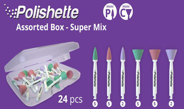 The assorted single-use pack is said to be a three-step polishing system for use on composites and hybrid ceramics. These mini-shaped polishers are pre-mounted and feature tapered shanks that reportedly offer precision and visibility when used.