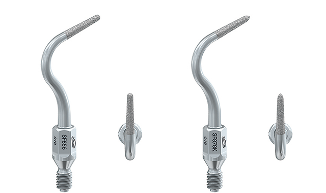 The Komet SonicLine instrument selection has been expanded to include two special Sonic tips for crown preparation, SF856.000.018 and SF878K.000.018, which correspond to Komet’s 856 (S6856.314.018) and 878K (S6878K.314.018) rotary crown-preparation diamonds, respectively. Sonic tip SF856.000.018 features a round tapered-chamfer configuration, while tip SF878K.000.018 provides a modified tapered-chamfer shape.