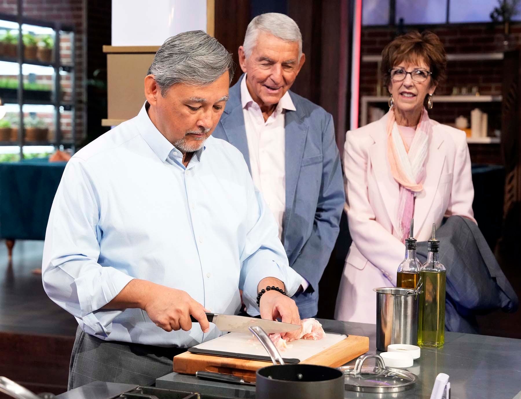 Chris Walinksi, DDS, prepares a dish as his birth father and his wife watch on the set of MasterChef. | © 2024 FOXMEDIA LLC. Cr: FOX.