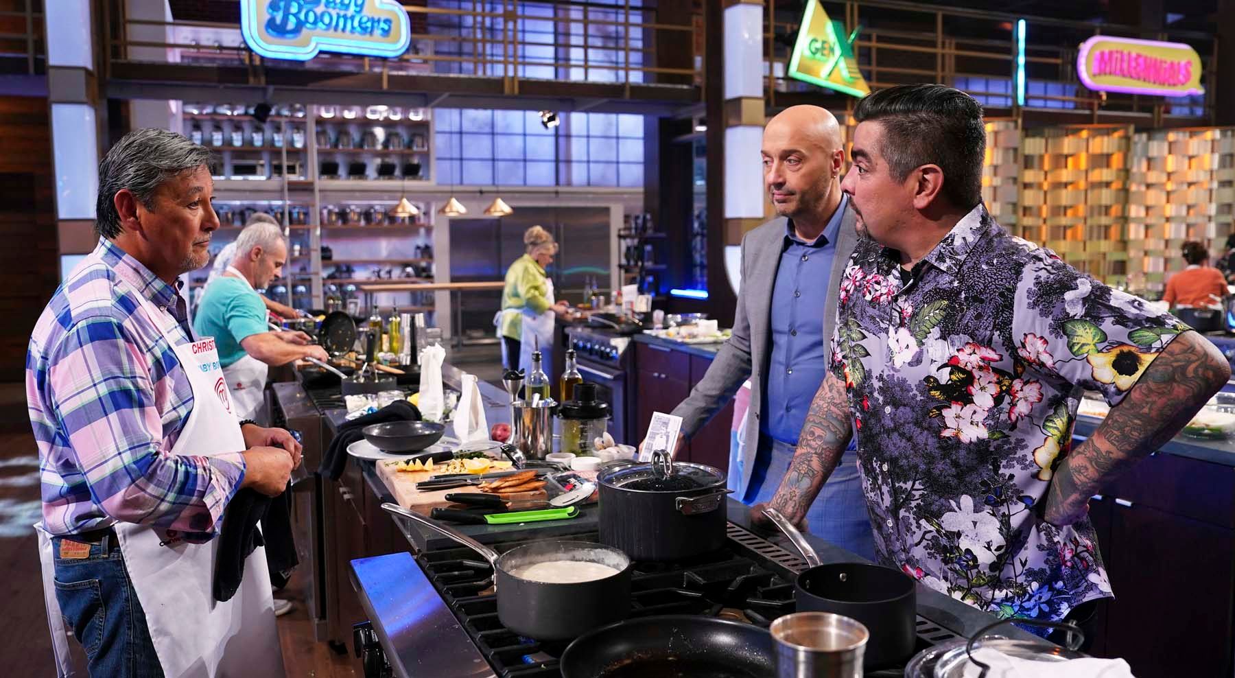 Chris Walinksi, DDS, talks with MasterChef judges Joe Bastianich (center) and Aaron Sanchez (right) during the Fox TV cooking show. © 2024 FOXMEDIA LLC. Cr: FOX.