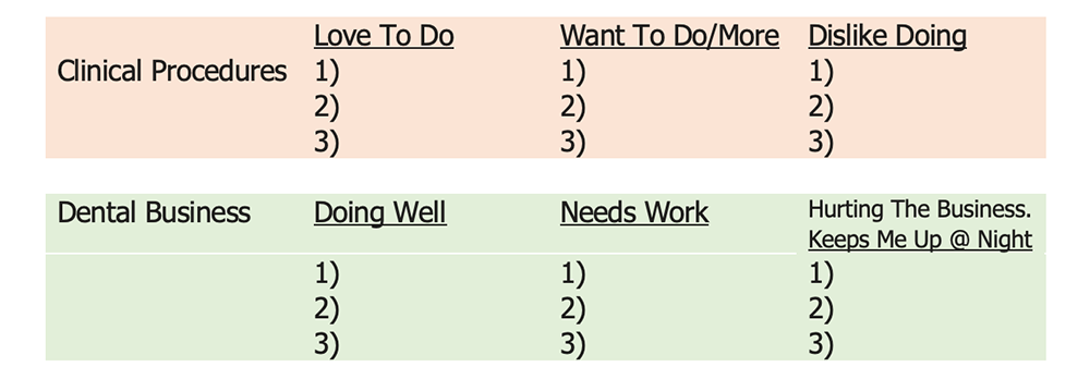 Every dentist has certain aspects of dentistry they love and other aspects, well … not so much. Those aspects can be on both the clinical and business side of the practice. In addition, there are always things you want to start doing, or areas where you need to improve.