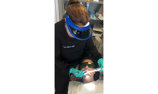 (Fig. 1) A dental hygienist utilizing Dentsply Sirona's SiroLaser Blue Diode for Laser Bacterial Reduction, or LBR.