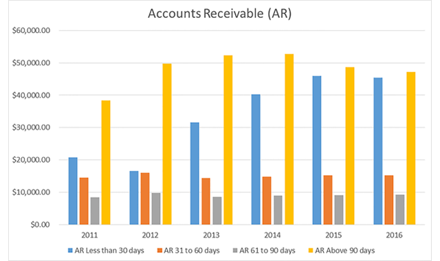 The largest outstanding accounts receivable balances were for over 90 days. Balances for 2016 were, on average, $47,228. However, outstanding balances for accounts receivable less than 30 days have been growing rapidly. In 2011, outstanding balances were, on average, $20,794 but by 2016 this number has risen to $45,377.