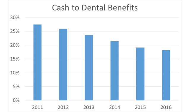 Since 2011, the percentage of patients using cash to pay for dental services has decreased significantly. In 2011, cash patients represented 28 percent of transactions. By 2016, they represented only 18 percent of transactions.