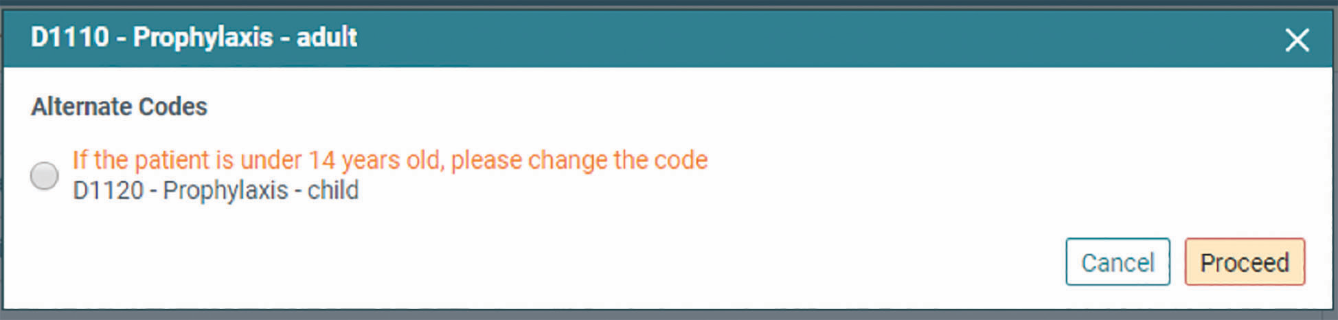 Let the software automatically “watch your back” by giving you alternate codes to consider. For example you enter a D1120 Prophylaxis child and an alert pops up reminding you that if the patient is 14 years old or older you need to change the code to a D1110 Prophylaxis adult and allows you to change it with a simple click of a mouse (Fig. 1). Or, if you mistakenly enter a D3320 Endodontic therapy Bicuspid when it is actually a retreatment which calls for a more appropriate D3348 Retreatment code-changing it to the correct code is still just a mouse click away.