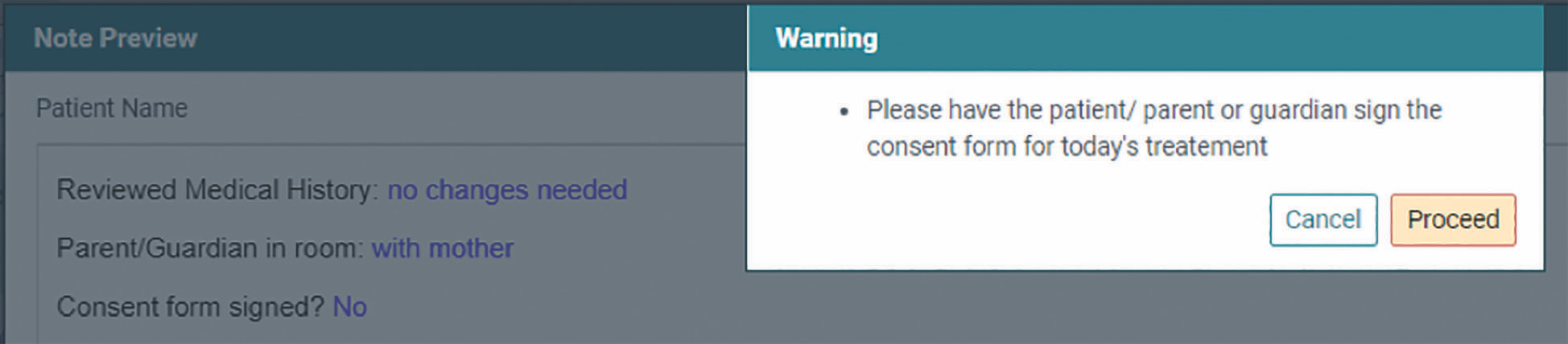 An example of a customized form rule would be adding a check box to the clinical template if a consent form was needed. The rule would be “if consent form was needed and was not previously filled out, then display on alert.” This makes sure all conditions are met before completing documentation (Fig. 3).