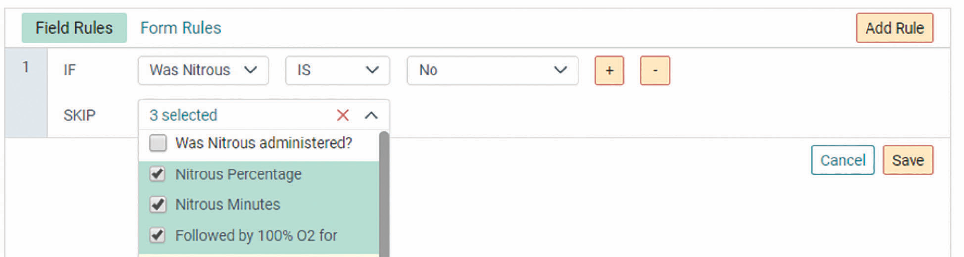 For example, a customized field rule would be “if yes was chosen for nitrous administered, then present additional options for percentage, minutes, etc.” However, if the answer was no, then the additional options for nitrous administered would not be presented (Fig. 2). The navigation through the note is quicker and unnecessary fields are not presented.