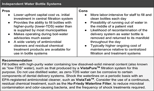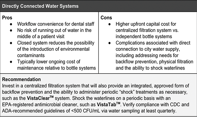 Whether dental operatories are plumbed directly to municipal water supply lines, utilize independent bottle systems, or have a water filtration system installed, the following protocols and guidelines should be observed at all times for dental waterline maintenance: