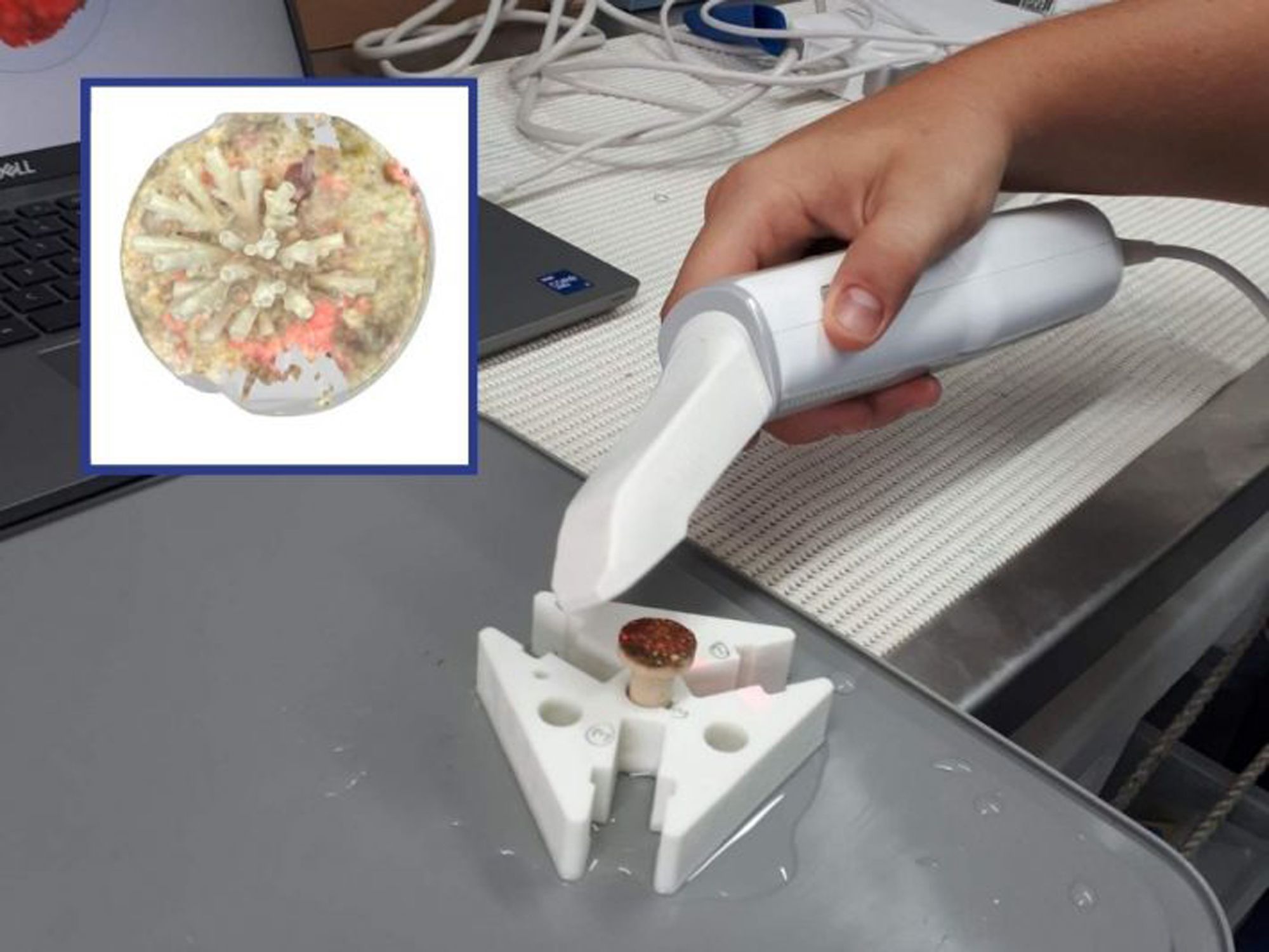 Though no scanners are waterproof to the extent of being fully submergible in ocean water, Dr Quigley hopes that in the future this could be possible. Regardless, being able to use it on a boat with wild corals brought up from the water helps to get accurate data.