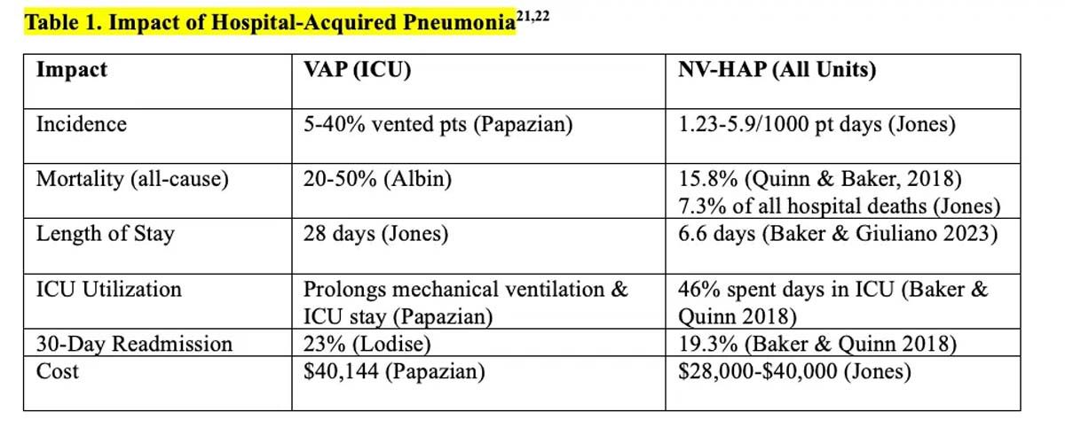 VAP and NV-HAP are frequent and serious preventable conditions that impact patients and healthcare systems. High mortality, increased length of hospital and intensive care unit (ICU) stays, increased utilization of ICUs, and frequent hospital readmission contribute to increased costs to patients, families, and institutions. (Table 1). In a retrospective case-control study of Medicare patients hospitalized in 2019, those with HAP were almost 3 times more likely to die within 90 days compared to matched controls without HAP, and those with HAP spent an extra week in the hospital, increasing the cost of care by 24%.3