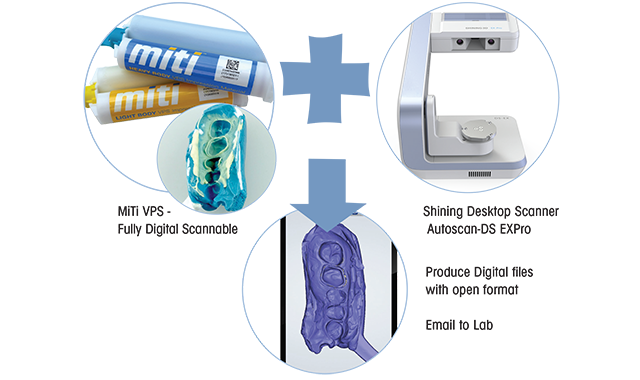 Enjoy the advantages of being fully digital without the costs, fees and frustrations of inter-oral scanning. The unique, patented MiTi Digital Scanning VPS, together with the affordable,Shining 3D Desktop Scanner makes this possible today, according to the company.