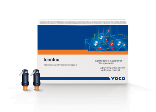 Ionolux, VOCO’s new light cured resin modified glass ionomer restorative, offers many new benefits that include composite-like esthetics, immediate packability, non-stick handling and improved physical properties for better longevity. Ionolux’s enhanced esthetics allows the practitioner to deliver a fluoride releasing restoration without the sacrifice of esthetics. Available in VOCO’s new easy-to-use direct activation capsule, Ionolux is radiopaque, comes in five shades, and does not require the use of an adhesive or dentin conditioner.