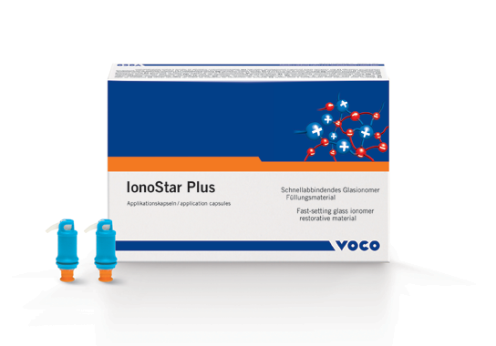 IonoStar Plus is a new glass ionomer restorative that offers a fast-set, immediate packability, non-stick handling and enhanced physical properties. IonoStar Plus comes in a new easy-to-use direct activation application capsule that fits virtually all applicators. IonoStar Plus offers two stages of consistency that first provide ideal wettability for perfect marginal adaptability, and then immediate packability to allow shaping and sculpting. IonoStar Plus has an abbreviated working time of two minutes that allows the clinical procedure to proceed quickly. IonoStar Plus is radiopaque, fluorescent, has a high continuous fluoride release and does not require the use of a dentin conditioner.