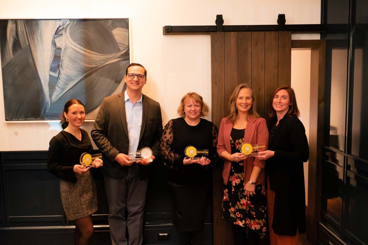 2023's Tellie Award winners, from left to right: Robyn Shafer, RDH, Mainely Teeth, Nathan Suter, DDS, Chief Innovation Officer & Dental Director, Enable Dental, Shawn Oprisiu, Director of Dental Outreach, Swope Health Services, Michelle Roman, RDH, Chair of Dental Hygiene, Middlesex College, and Nadine Thompson, RDH, Instructor, Middlesex College. Winner Marko Vujicic not pictured. Image credit: © MouthWatch, LLC