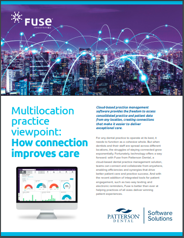 For any dental practice to operate at its best, it needs to function as a cohesive whole. But when dentists and their staff are spread across different locations, the struggles of staying connected grow exponentially. Fortunately, technology offers a way forward: with Fuse from Patterson Dental, a cloud-based dental practice management solution, teams can connect and collaborate from anywhere, enabling efficiencies and synergies that drive better patient care and practice success. And with the recent addition of integrated tools for patient engagement, such as two-way texting and electronic reminders, Fuse is better than ever at helping practices of all sizes deliver winning patient experiences.