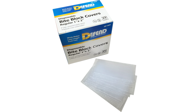DEFEND Bite Block Covers are 1” x 2” and come packaged with 300 per box. The product is now available through most dental dealers.