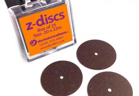 When contacting Dental Creations, you can identify Z-Discs by item number 551. A box of 25 discs retails for $19.95. For more information, call 254-772-4661 or visit wonderfill.com.