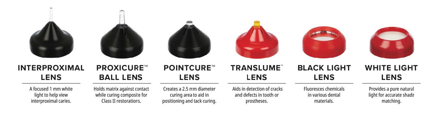 The new line of accessories consists of the following 6 lens versions: Interproximal, Proxicure Ball, Pointcure, Translume, Black Light, and White Light.