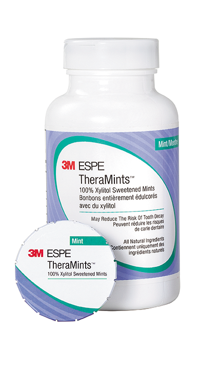 The goal of today’s dental professional should include comprehensive assessment of salivary flow, possible identification of causative factors, elevating the comfort level of the patient and the administration of preventive measures to avoid further oral complications. There are a number of conservative lifestyle changes that will assist the xerostomic patient who’s struggling with mild to moderate discomfort. These include reducing the intake of caffeine products, sucking on ice chips, sipping water throughout the day and with meals, avoidance of sticky, salty, spicy or hard foods, limiting alcohol intake, avoiding mouth rinses containing alcohol, chewing xylitol gum, or sucking on xylitol mints (Fig. 2), use of fluoridated or amorphous calcium phosphate toothpastes, using a humidifier at night while sleeping, and the use of lubricants on lips. Of utmost importance is regular preventive dental care and the use of fluoride varnishes proactively or extended contact varnishes on any vulnerable white spot lesions or exposed root surfaces (Fig. 3).