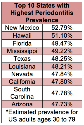 In a recent study published by the Journal of Dental Research, the Centers for Disease Control and Prevention (CDC) estimates that at 52.79% and 51.10% respectively, New Mexico an d Hawaii have the United States’ highest prevalence of periodontal disease.