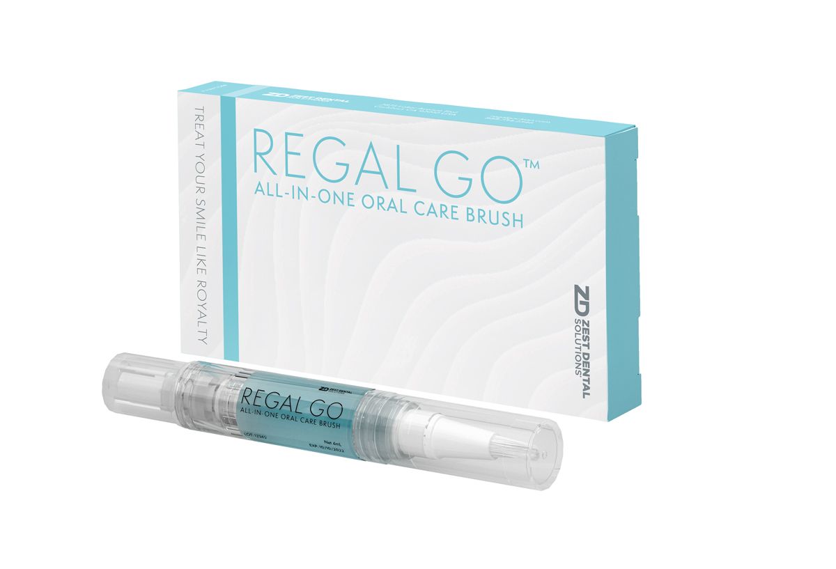 Regal GO from Zest Dental is a brush that is specifically designed to boost oral hygiene combining with a formulated cleaning gel, according to a press release from Zest Dental. This new system was created with the LOCATOR FIXED® full-arch solution from Zest Dental in mind but is suitable for other implant systems as well as orthodontic appliances and natural teeth. Through its fine-bristled, pen applicator, Regal GO allows patients to reach all areas of the mouth to thoroughly clean, freshen, and meet their oral hygiene needs. This sleek-designed applicator also makes it easier to apply the cleaning gel under fixed prosthetics, around implants, and generally work around brackets and wires. Patients can directly subscribe to get their Regal GO offerings, which come in a regular size and a suitable for travel Regal GO mini size.