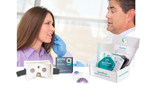 Speed2Treat Home Healing Kit offers a 4-week care plan along with multiple components that a patient can use, including a temporary overnight oral appliance; hot/cold therapy packs; patient self-care instructions; and online resources that include pain education, prescribed exercises, and calming virtual reality experiences linked with a smartphone.