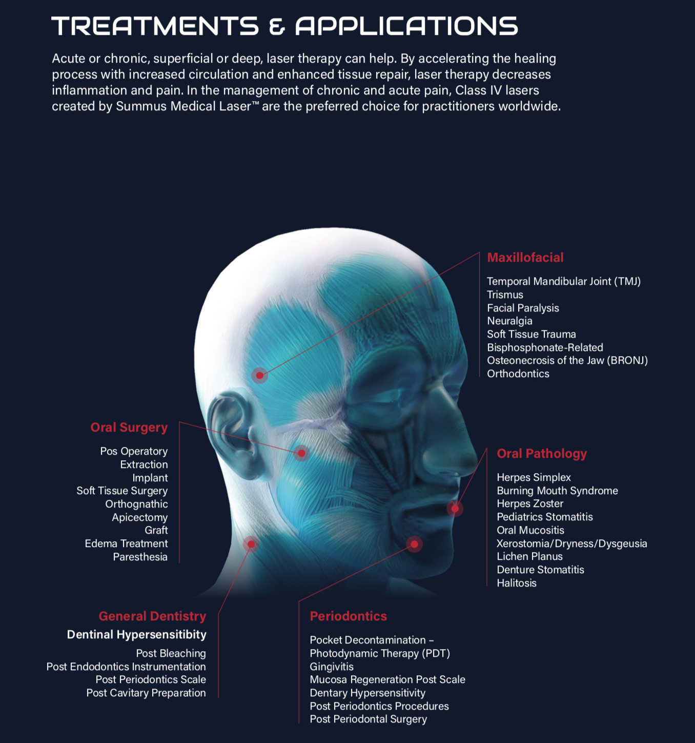 Summus Medical LasersTM deliver specific red and near-infrared wavelengths of laser light to induce a photochemical reaction and therapeutic effect. Laser therapy has been used in Europe since the 1970s and Summus Medical Laser was cleared by the United States Food and Drug Administration (FDA) in 2005.