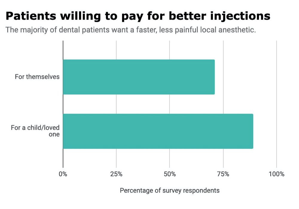 More than 7 in 10 patients would be willing to pay that extra cost if their dentists used a faster, less painful local anesthetic, the survey found. More than half were willing to pay at least 10% more for the procedure.